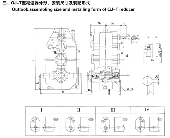 QJ-T立式齒輪減速器常用傳動比:16,18,20,22。4,25,28,31。5,35。5,40,45,50,56,63,71,80,90,100,裝配型式有四種,即I,II,III,IV