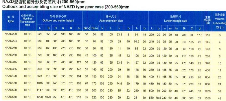 型號有:NAZD200行星齒輪減速機,NAZD224行星齒輪箱,NAZD250行星減速箱,NAZD280行星減速器,NAZD315行星齒輪減速器,NAZD355行星齒輪減速箱,NAZD400行星齒輪減速機,NAZD450行星減速器,NAZD500行星齒輪減速器,NAZD560,NAZD560A,NAZD630,NAZD710,NAZD800,NAZD900,NAZD1000